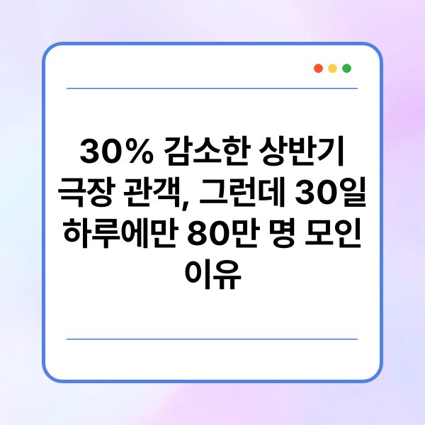 상반기 극장 관객 수의 30% 감소는 코로나19의 영향과 영화 흥행 저조로 인한 결과입니다. 그러나 30일 하루 80만 명의 관객 수 기록은 특정 영화의 개봉과 프로모션의 효과로 설명할 수 있습니다. 영화관은 앞으로도 관객의 요구에 맞춘 다양한 전략을 통해 관객 수 회복을 도모해야 할 것입니다.